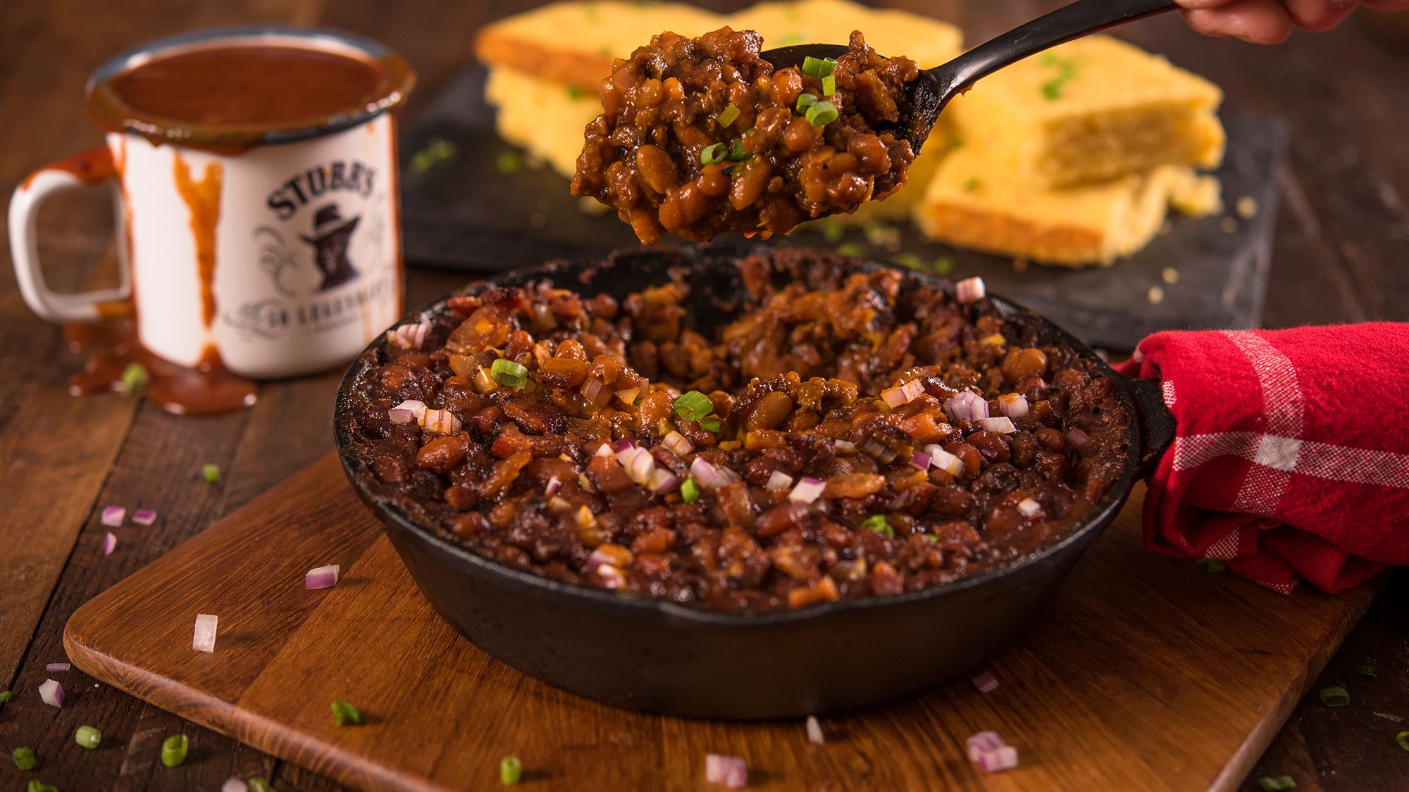 Since these baked beans contain ground beef, sausage, and bacon, they are a meal in their own right.